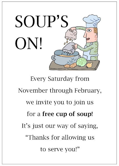 I'm excited to say that tomorrow, November 10th we'll be serving us some very special Potato Soup! The fact that it's homemade has an extra special meaning! Stop in and enjoy a cup, won't you? We'll be serving from 9:00 am to 3:00 pm, or until the pot runs dry!